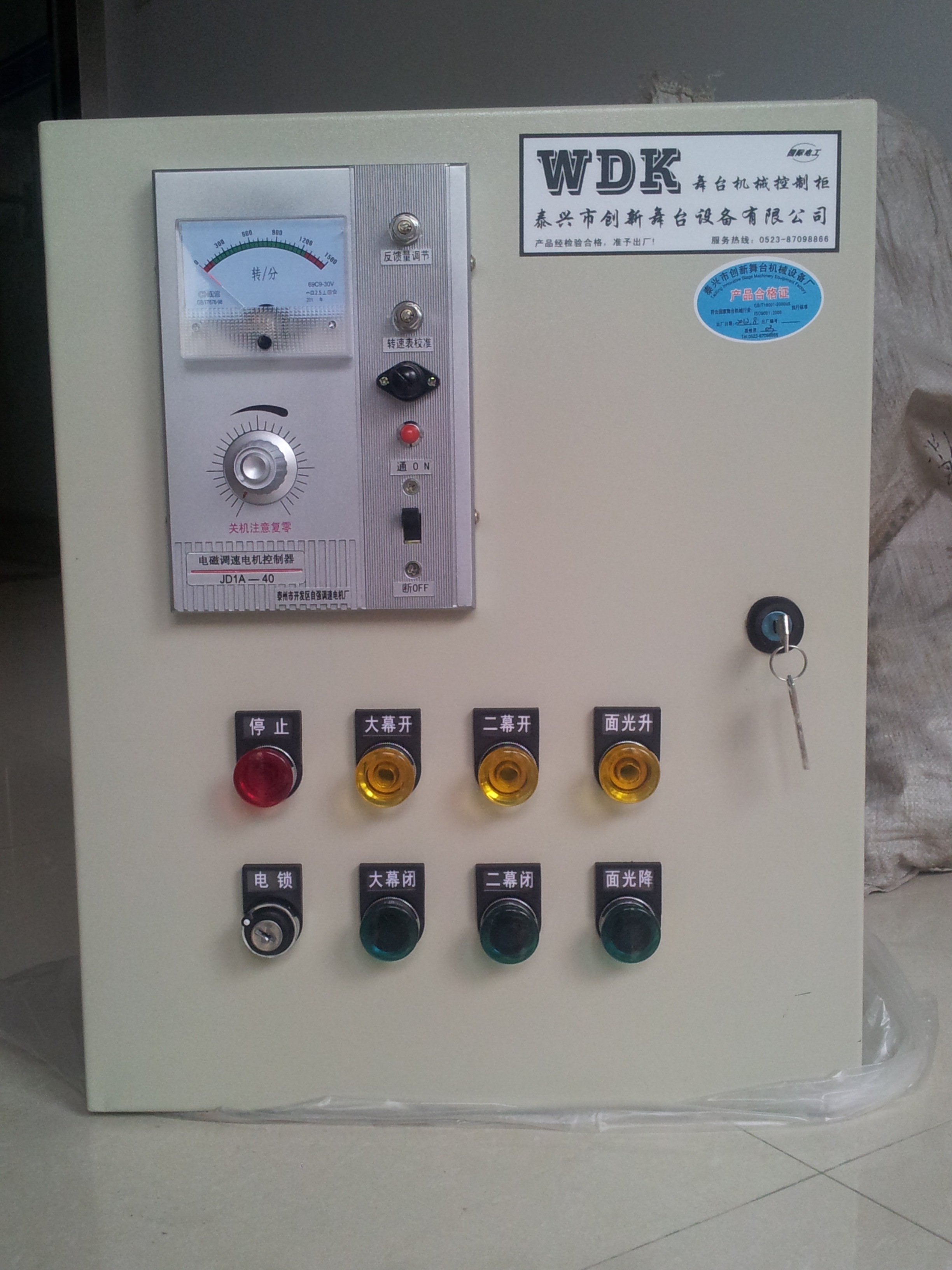 舞台机械控制系统,可对电动吊杆进行单控/集控时可对六根电动吊杆同时控制,可进行位置记忆;并按记忆位置反复运行,内含有用户自定义的十场位置记忆功能,操作台上设有紧急停车按钮,用来实现特殊情况下的紧急停车。操作台由开关键及其它显示元件组成。